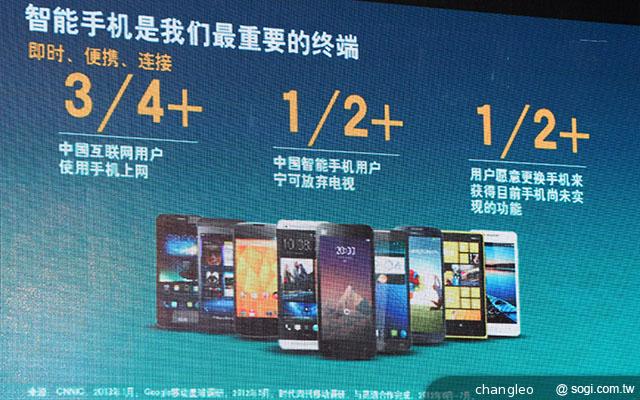 ▲Matt Grob 表示,智慧型手機由於具備即時、便攜、連接等特性,早已成為每個人重要的終端設備,現今中國已有超過 3/4 以上的網路使用者是透過手機上網,有一半以上的使用者寧可放棄使用電腦,更有超過一半的使用者願意透過更換手機獲取新的功能。