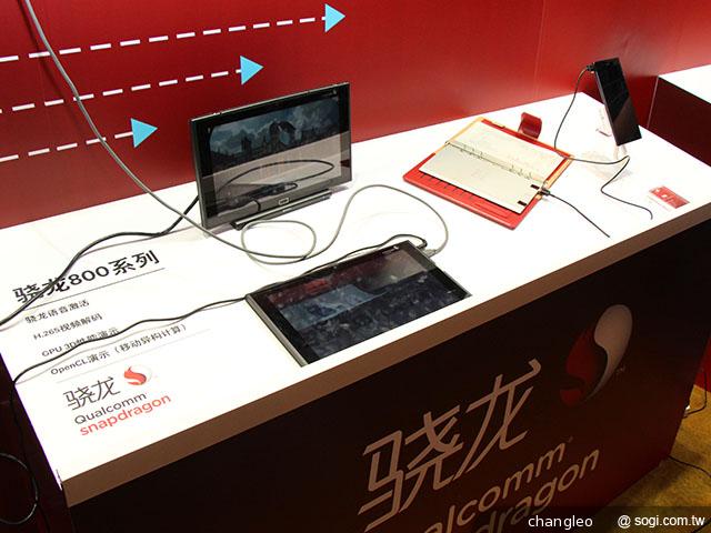 ▲Qualcomm Snapdragon 800 系列行動裝置,則是展示 3D 性能、OpenCL 等項目。